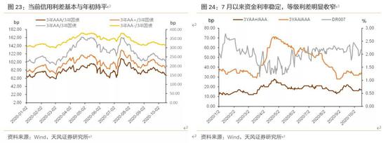 (2)5-7月:4月中下旬开始,国内疫情得到控制,社融及各项经济数据复苏超预期,央行货币政策逐步收紧,债市大幅调整,然信用债调整相对滞后,信用利差5-6月被动压缩,至7月信用债继续调整,利差走阔。