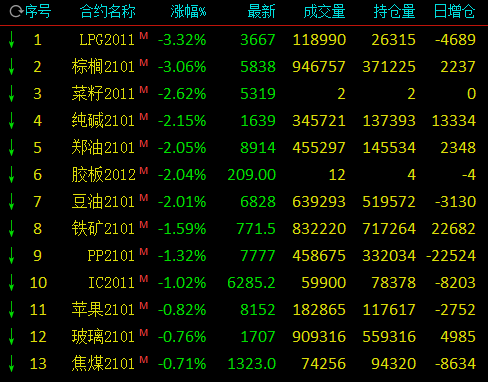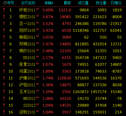 热点栏目10月19日,国内期市早盘涨跌不一;能化品多数上涨,橡胶冲高回落仍涨近4%,短纤涨逾3%,苯乙烯涨逾2%,LPG则跌逾3%;农产品涨跌互现,豆一涨逾3%,郑棉涨近3%,棕榈油跌逾3%,菜籽、菜油跌逾2%;黑色系多数下跌,铁矿石跌逾1%;基本金属多数上涨,沪镍、沪铝涨逾1%。