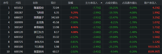 从个股来看,隆基股份、飞利信、国盾量子分别遭主力资金卖出7.75亿元、2.99亿元、2.91亿元。