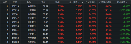 从个股来看,主力资金最青睐的3只股票分别是中国平安、若羽臣、中芯国际,流入金额分别为5.89亿元、3.96亿元、3.75亿元,所对应的涨幅分别为0.70%、4.47%、3.90%。