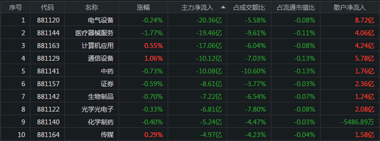 主力资金流出的板块分别是电气设备、医疗器械服务、计算机应用,主力资金流出金额分别为20.36亿元、19.46亿元、17.06亿元,其中散户净流入金额为8.72亿元、4.06亿元、4.24亿元。