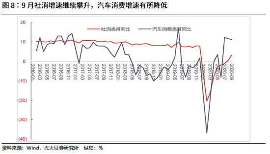 一季度居民消费受到疫情明显冲击,但由于消费棘轮效应的存在,下降幅度比生产、投资要小。二季度,消费修复慢于生产,但快于投资,且从3月中下旬以来,中央和地方分别出台一系列包括税收减免、消费补贴等刺激汽车消费等政策,在政策作用下,汽车消费率先反弹,对消费起到了一定支撑作用。7-8月,汽车消费均维持在较高水平(同比分别为12.3%、11.8%),汽车消费一定程度上支撑了社消的修复。而9月汽车消费增速降至11.2%,社消整体增速则提高了2.8个百分点,说明消费恢复对汽车的依赖降低,更多的来自消费整体的趋好。