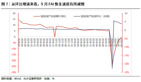 1-9月,全国固定资产投资43.65万亿元,同比增长0.8%,而1-8月为下降0.3%,年内累计值同比增速首次转正。从同比增速提升情况来看,9月提升了1.1个百分点,提升幅度继续减小(提升幅度自3月以来持续下降)。另外,从环比速度看,9月份固定资产投资增长3.37%,比8月下降0.43个百分点,环比改善的速度虽依然较高,但3月以来持续下降,也印证FAI修复的速度在放缓。