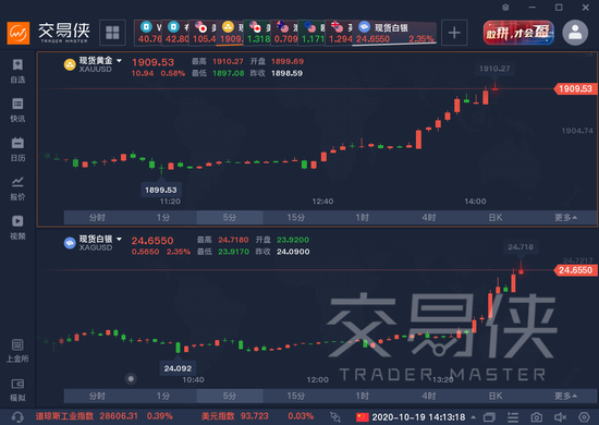 周一,现货白银日内持续走高,午后涨幅扩大至2%,报24.57美元/盎司,随后不久,现货黄金站上1910美元/盎司,日涨幅扩大至0.6%。