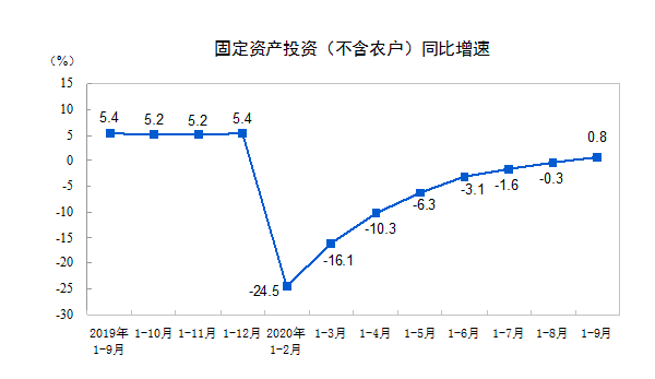 投资方面,前三季度,全国固定资产投资(不含农户)436530亿元,同比增长0.8%,增速年内首次由负转正,上半年为下降3.1%。