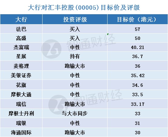大行:汇丰控股最新投资评级及目标价(表)
