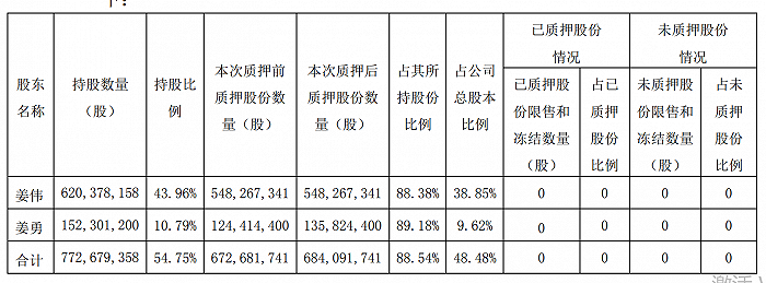 据10月17日的最新公告显示,姜伟及其一致行动人合计持有的公司54.75%股权(7.73亿股),大多都处于质押状态,质押比例达88.54%(姜伟88.38%,姜勇89.18%),也就是说相当于上市公司48.48%股权,处于质押状态。并且未来半年内到期的质押股份累计数量为6.71亿股,占其所持股份比例的86.85%,占公司总股本比例为47.55%,对应融资余额为26.32亿元。未来一年内,到期的质押股份累计数量为6.84亿股,占其所持股份比例为88.54%,占公司总股本比例为48.48%,对应融资余额为26.72亿元。