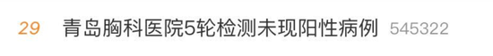 她还透露,目前青岛市胸科医院已暂停诊疗,并进行严格的隔离防控,继续开展核酸筛查,青岛市胸科医院已完成5轮核酸检测,未发现阳性病例。