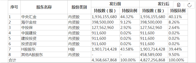 本次发行前后的持股比例方面,招股说明书显示,本次发行前,中央汇金持股比例达44.32%,为第一大股东,海尔金控持股9.12%。本次IPO后,中央汇金持股比例降至40.11%,海尔金控持股比例降至8.26%。