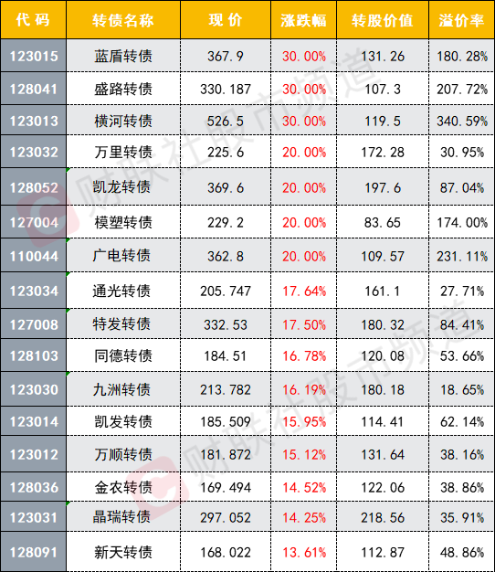 受可转债带动,正股也纷纷大涨,蓝盾转债正股蓝盾股份股价一度冲高至14%,横河转债正股也一度大涨12%。