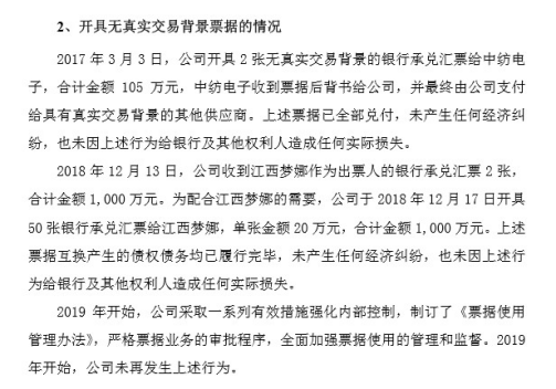 招股书显示,2017年3月3日,公司开具2张无真实交易背景的银行承兑汇票给中纺电子,合计金额105万元,中纺电子收到票据后背书给公司,并终由公司支付给具有真实交易背景的其他供应商。上述票据已全部兑付,未产生任何经济纠纷,也未因上述行为给银行及其他权利人造成任何实际损失。