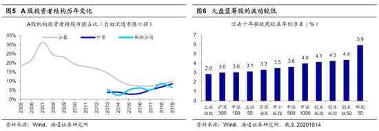 如果从现金账户推进,大盘蓝筹或先试点。我们认为A股当前暂不具备全面推进T+0的条件,但是可以先从部分试点着手,从账户分层的角度看,我们认为如果T+0从现金账户开始推进,则大盘蓝筹股会成为对应的标的试点。整体来看,我们认为A股目前暂不适合一步到位全面实行T+0交易,主因是投资者结构还不完善。目前我国股市中,散户的占比还很高,根据上交所统计散户交易占比占80%以上,而从持股市值角度看,A股自由流通市值口径下,20Q2散户持股市值占比为37%,自然人和法人占比26%,机构占比为31%(公募11.5%、外资8.9%、保险类资金6.4%、私募3.9%),相比之下,2019年美股市值中Household Sector(散户、自然人及非盈利型组织等)持股市值占比为38%,政府及其他占比为5%,机构投资者为57%(较大的机构投资者如共同基金及ETFs占比28%、外资15%、养老金等险资11%)。此外,由于公募基金的资金来源80%来自散户,叠加公募基金业绩考核周期较短等原因, A股以公募为代表的机构投资者更加重趋势,风格和行业轮动更快,部分机构投资者投资行为散户化,进一步加大了A股的波动。今年10月9日,国务院发布《国务院关于进一步提高上市公司质量的意见》,明确提出“探索建立对机构投资者的长周期考核机制,吸引更多中长期资金入市”,未来随着制度的推进和资本市场的发展,A股机构投资者的占比会逐步上升。站在当前时点,我们认为T+0如果要在A股推行,参考中国台湾在推进现金现券账户下的T+0制度经验,大盘蓝筹股或因市值大、波动小而作为试点先行。我们以过去十年各大指数周度收益率的标准差来衡量各大指数的波动性,上证综指、沪深300、中证100和上证50的波动性最小,分别为2.8%、3.0%、3.0%、3.1%,创业板50、创业板综和创业板指的波动性更大,分别为4.4%、4.3%、4.1%,科创50的波动最大,为5.9%。此外,中国台湾和日本在推进现金现券账户下T+0制度时,分别对T+0的方向(先推进先买后卖,后放开先卖后买)和次数(单方向单日一次)做出了限制,可以作为A股的参考。