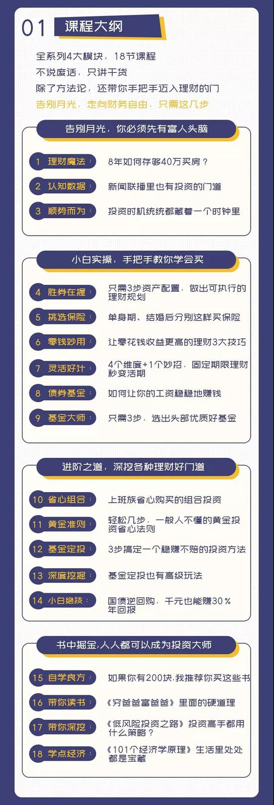这个课程没有枯燥的理论知识,从最实用的实操方法入手,解决你没时间、没精力学习深奥理财知识的问题。