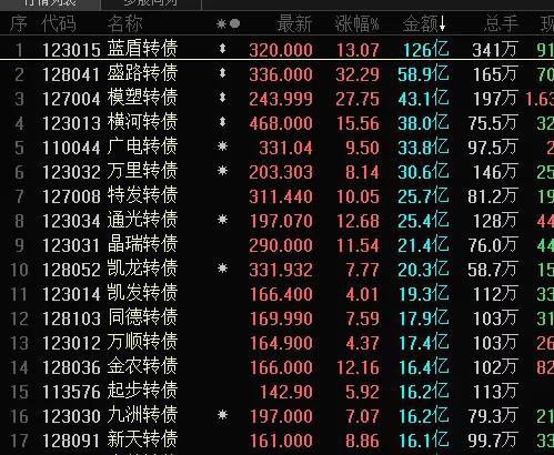 从成交情况来看,今日共有17只可转债成交额在10亿元以上,分别是蓝盾转债、盛路转债、模塑转债、横河转债、广电转债等。蓝盾转债以126.2亿成交额排在首位,且超过A股任何一只股票今日成交额。由于巨量成交,今日多只可转债筹码换了至少1遍。数据显示,35只可转债换手率超过100%,其中16只可转债换手超10倍,包括蓝盾转债、盛路转债、横河转债、凯龙转债、模塑转债、广电转债、特发转债、晶瑞转债等。