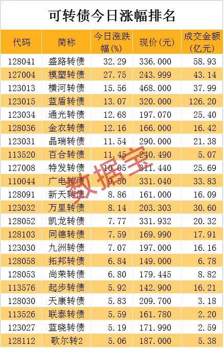 除了蓝盾转债,可转债市场中多股涨幅超过10%,包括盛路转债、模塑转债、横河转债、通光转债、金农转债、晶瑞转债等。涨幅最高的盛路转债今日盘中最高涨超63%,尾盘收涨32.29%,最新价格336元,相对账面价值溢价2.36倍。