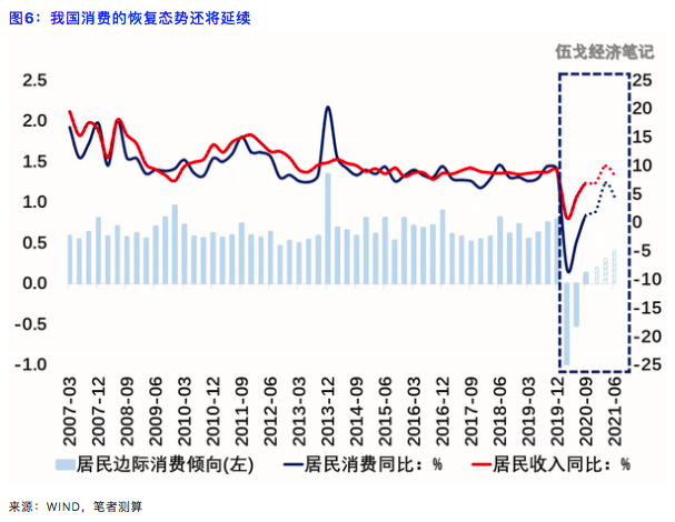 展望未来,疫情虽时有复发,但对消费意愿的影响或边际递减。疫苗普及之前居民消费倾向的完全恢复固然还需时日,但逐步恢复已是大势所趋。叠加经济回升过程中居民收入的逐步改善,未来消费恢复的趋势还将延续。考虑到地产与基建放缓下投资边际趋缓,出口进一步上升的空间也相对有限,未来消费回升的速度有望快于其他经济动能。