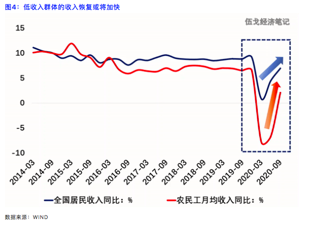 三是展望未来,疫情虽时有复发,但对消费意愿的影响边际递减。值得一提的是,随着服务业逐步好转,农民工等低收入者收入恢复加快,而其消费倾向大于高收入者,这有助于整体消费抬升。鉴于投资和出口或边际趋缓,消费回升仍有空间且速度有望快于其他经济动能。