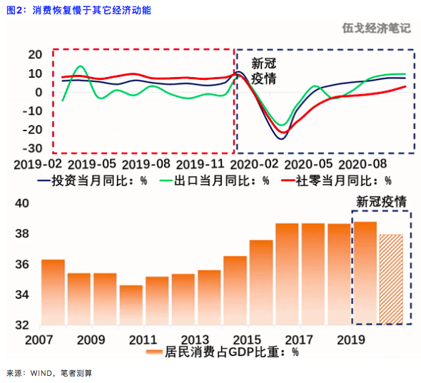 一是过去几年我国消费的同比增速都明显高于投资和出口。但疫情以来,该趋势发生逆转,消费开始慢于其他经济动能,且其在经济中的占比也由近年来的上升态势