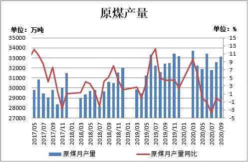 2020年9月份,全国原煤产量33107万吨,同比下降0.9%;较8月份的32581万吨增加526万吨,增长1.61%。2020年1-9月份,全国累计原煤产量278715万吨,同比下降0.1%。 进入9月份后,全国主产地安检、环保等进一步趋严,制约煤矿产能的释放,致使煤炭供应量一直呈现略显偏紧的状态。9月份全国原煤产量同比降幅较8月份有所扩大。