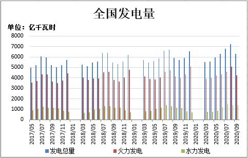 2020年9月份全国绝对发电量6315亿千瓦时,同比增长5.3%。其中,全国火力绝对发电量4223亿千瓦时,同比增长0.2%;水力绝对发电量1385亿千瓦时,同比增长22.8%。从环比来看,9月份全国发电量环比减少923亿千瓦时,下降12.75%;火电发电量环比减少867亿千瓦时,下降17.03%;水力发电量环比减少25亿千瓦时,下降1.77%。2020年1-9月份全国绝对发电量54086亿千瓦时,同比增长0.9%。其中,全国火力绝对发电量38316亿千瓦时,同比下降0.3%;水力绝对发电量9025亿千瓦时,同比增长0.9%。9月份发电量呈现增加,但是增幅较上月缩窄;水火电同比均呈现增加,其中水电增幅较大;水火电环比均呈现减少,其中火电减幅更大;水电尚未进入枯水期,发电份额还未减少。