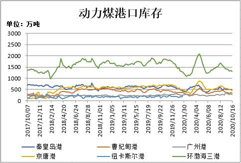 截至10月16日,秦皇岛港煤炭库存为500.5万吨,较上月同期减少2万吨;曹妃甸煤炭库存量为352.8万吨,较上月同期减少20.5万吨;京唐港煤炭库存量为458.7万吨,较上月同期减少73.8万吨。环渤海三港的总库存为1312万吨,较上月同期减少96.3万吨,减幅6.84%。广州港煤炭库存284.1,较上月同期减少33.7万吨。自8月中旬以来,动力煤港口库存呈现下跌,受大秦线脱轨影响,集港量明显减少,国庆节后大秦线又进入检修状态,所以整体集港量明显减少。