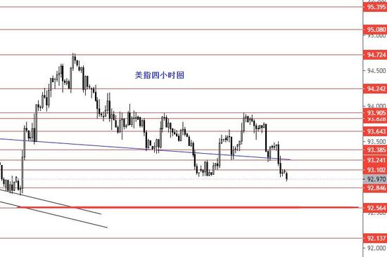 美指本周初向下运行,再创近期新低。从图形来看,周一的思路错误,后市继续关注92.50区域强支撑,在没成功下破前,前期大波段思路还可以用,若成功跌破后,前期思路就要全部扔掉重新分析。今天日内短线暂无具体操作建议,美指短线太弱,但今日追空也不合适,再做多也太激进,所以建议观望,等待图形企稳向上或成功下破后再做下一步打算。