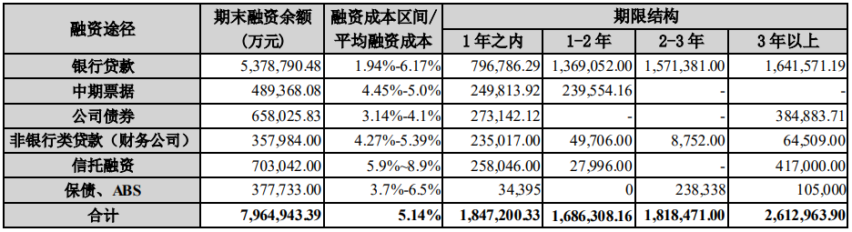 在盈利下降的同时,大悦城的融资及负债规模在上升。截至6月末,其总负债规模为1549亿元,较2019年末增长9.31%。其中,融资余额796.49亿元,包括银行贷款537.88亿元,中期票据48.94亿元,公司债券65.80亿元,非银行类贷款(财务公司)35.80亿元,信托融资70.30亿元,保债、ABS37.77亿元,合计较2019年末增长15.24%。