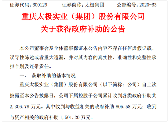 监管函指出,太极集团多次收到的政府补助,累计或单笔金额多次达到应当披露的标准,但公司未按规定及时披露,损害了投资者的知情权。