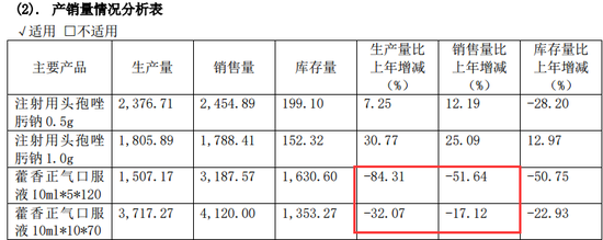 以藿香正气口服液(10ml*5*120)为例,产品在2018年生产量增加13.95%,销售量减少28.46%,库存量增加超10倍;2019年,该产品生产量则直接同比骤降84.31%,销售量同比降51.64%。