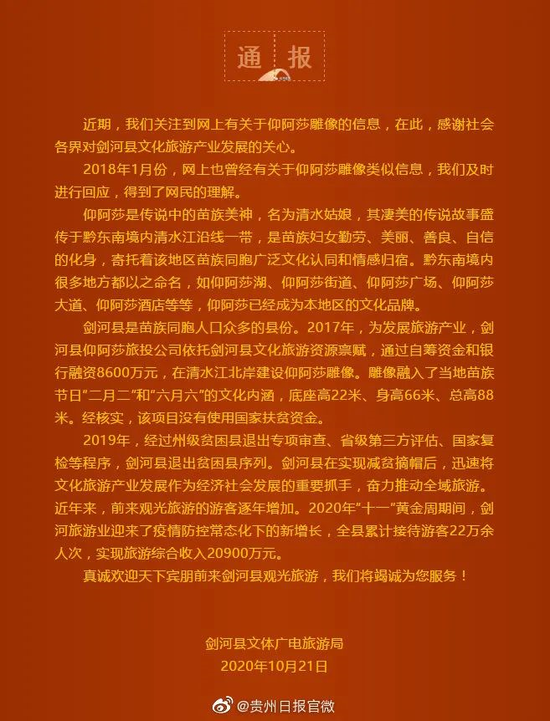 据新京报报道,10月21日,剑河县文体广电旅游局旅游办一名工作人员告诉新京报记者,仰阿莎雕塑旅游项目的开发,是由剑河县仰阿莎旅投公司负责,没有使用国家扶贫资金和国家财政拨款,“没有用国家的一分钱。”
