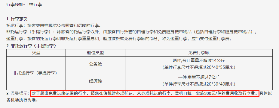 中国网财经记者发现,在祥鹏航空的行李须知中,确实有“超出免费范围,统一收取300元每件的行李费”等相关提示。