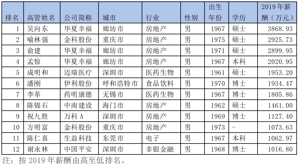 从可获取的数据来看,2019年薪酬达到百万元及以上的有1179人,占比超过35%。其中,薪酬超千万的有12人,分别是华夏幸福(600340.SH)吴向东、金科股份(000656.SZ)喻林强、华夏幸福俞建、华夏幸福孟惊、迈瑞医疗(300760.SZ)成明和、伊利股份(600887.SH)潘刚、药明康德(603259.SH)李革、中南建设(000961.SZ)陈锦石、万科A(000002.SZ)祝九胜、金科股份方明富、生益科技(600183.SH)陈仁喜以及中国平安(601318.SH)谢永林。标点财经研究员注意到,来自房地产行业的总经理占据了7个席位,可谓相当惊人。