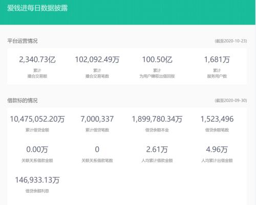 从爱钱进的官网上来看,截止到目前,爱钱进平台还在运营中,平台官网的数据披露截至时间为2020年10月23日,借款标情况截至时间为2020年9月30日,借贷余额尚有189亿。