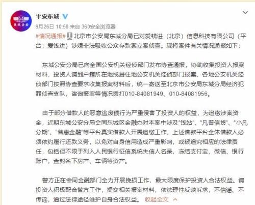 今年9月,北京市公安局东城分局对爱钱进(北京)信息科技有限公司(平台:爱钱进)涉嫌非法吸收公众存款案立案侦查。