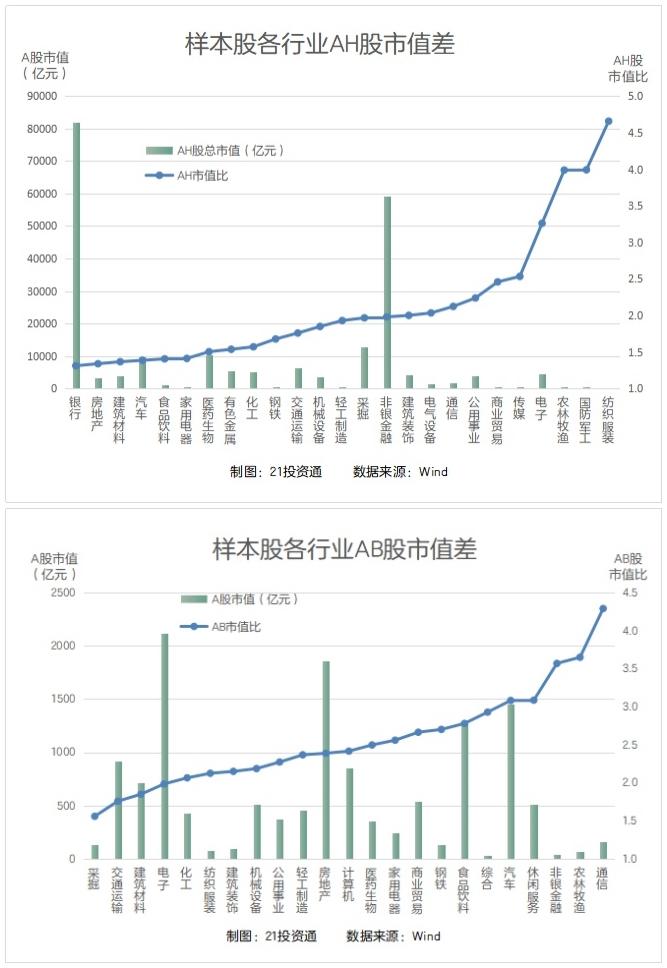从样本股的行业来看,一般来说,市值越大的行业,不同市场的估值价差越小,这在AH市场表现尤为明显。