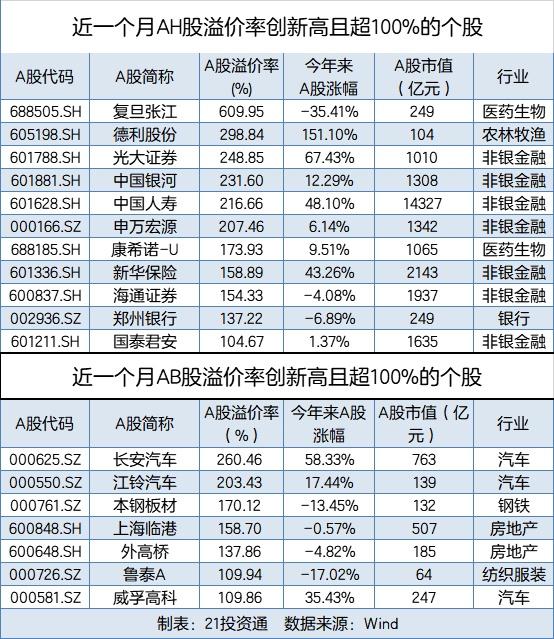 据21投资通统计,截至10月22日,128只个股同时在AH股上市,78股同时在AB股上市,其A股均存在较大的溢价率。