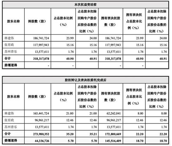 在股权转让及表决权委托完成后,林建伟、张育政方面拥有表决权的股数占中来股份总股本的22.20%,姜堰道得拥有表决权的股数则占中来股份总股本的18.70%。