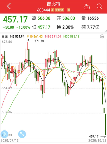 除“酱菜茅台”外,另一只300亿大白马“游戏茅台”吉比特也跌停。早盘吉比特股价迅速下挫,盘中股价跌停,这也是该股近3个交易日中的第二次跌停。昨晚公司发布的三季报显示,从单季度来看,第三季度公司实现营收6.4亿元,同比增长32.2%;归母净利润为2.45亿元,同比增长19.65%。营收及净利增速低于此前市场预期。