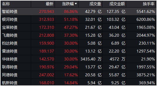 近期大火的可转债市场早盘冰火两重天。智能转债大涨86.86%,半日成交127.35亿元。银河转债大涨51.18%,半日换手率超62倍,而其正股金银河早盘下跌了3.12%。多只转债涨幅超30%,交易情绪依旧高涨。