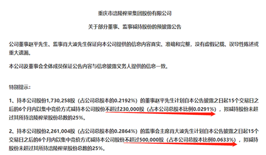 10月21日,涪陵榨菜还发布了关于部分董事,监事减持股份的预披露公告。合计持股比例0.5%的两大股东拟在未来半年内减持不超过73万股公司股份,减持比例不超过0.0924%。