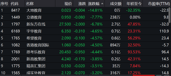 热点栏目教育股在美股频频爆雷,港股教育股集体大跌,其中,大地教育跌15%,立德教育跌8%,新东方在线跌近7%,宇华教育、希望教育跌超4%。