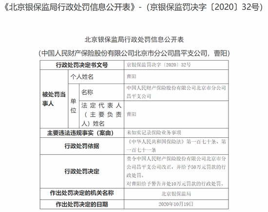 10月23日消息,北京银保监局公布的行政处罚信息公开表显示,中国人民财产保险股份有限公司北京市分公司大兴支公司、昌平支公司和海淀营业部因未如实记录保险业务事项,被责令改正并分别处罚款50万元、50万元和40万元。同时,相关责任人吴卫、曹阳受到警告处分并被罚款10万元;宋悦受到警告处分并被罚款7万元。