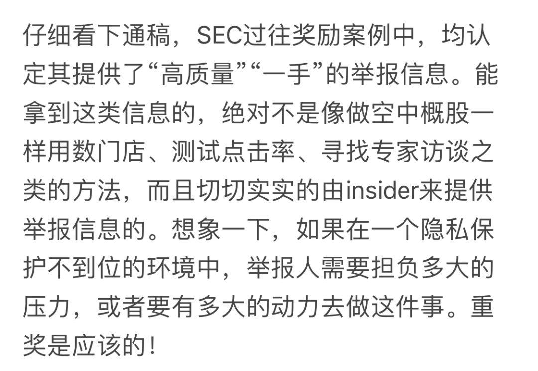 另外,《多德-弗兰克法案》规定,SEC会保护举报人的机密性,不会披露可能泄露举报人身份的信息。