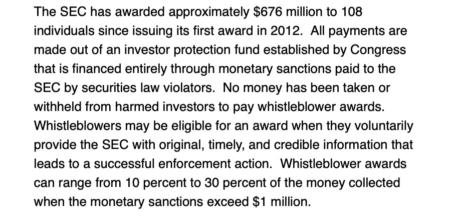 同时,SEC官网显示,所有款项都来自国会设立的投资者保护基金,该基金的资金完全来自违反证券法者支付给SEC的罚款。没有向受害投资者收取或扣留任何资金来支付举报人的奖金。如果举报人自愿向SEC提供原创、及时、可信的信息,从而导致执法行动的成功,他们可能有资格获得奖励。如果制裁金额超过100万美元,检举人将获得的奖金为罚款金额的10%到30%不等。