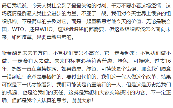 今天人类到了最关键时刻,千万不要小看这场疫情,这是倒逼人类进步的力量,其影响力不亚于二战。从金融本身讲,其带来巨大影响也远超过当下讨论的技术层面的问题。
