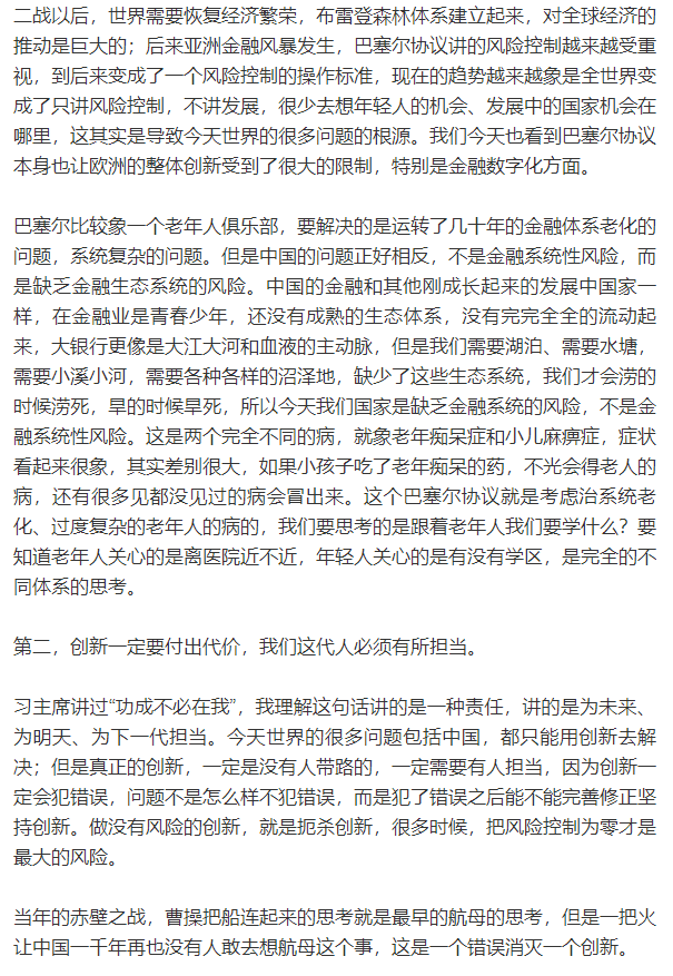 中国金融“没有系统性风险”,因为“没有系统”,我们的金融还是“青春少年”,还没有完全成熟起来。他指出,缺少健康金融系统,旱的旱死,涝的捞死。创新是一定要付出代价的,为未来担当,不能用昨天的办法来管未来。