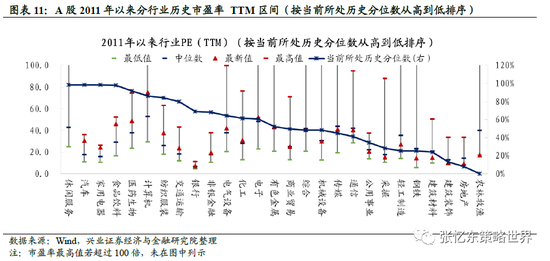 休闲服务(99%)、汽车(99%)、家用电器(98%)、食品饮料(98%)、医药生物(92%)、计算机(86%)、纺织服装(84%)、交通运输(80%)行业市盈率TTM 处于相对较高分位数水平。