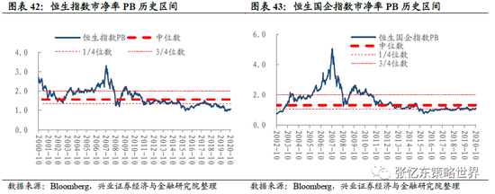 截至10月23日,恒指预测PE(彭博一致预期)为13.1倍,处于2005年7月以来的中位数和3/4分位数之间;恒生国指预测PE为9.7倍,处于2005年7月以来的1/4分位数和中位数之间。