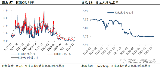货币市场利率:截至10月23日,相较于上周五,本周HIBOR隔夜利率下降2.0bp至0.05%,7天利率上升0.1bp至0.13%,1个月利率上升8.3bp至0.44%。