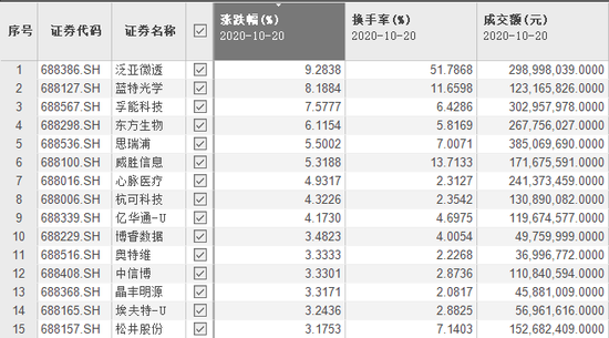 成交额方面,今日科创板全天成交额达238.87亿元,较上个交易日有所放大。其中康希诺成交额居首达15.5亿元,科思科技成交额达14.84亿元位居第二,有122只个股成交额不足1亿元。